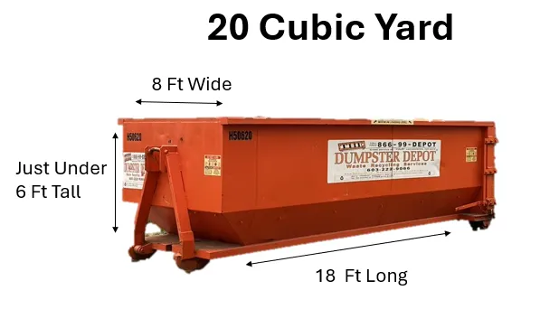 All of the temporary open top dumpsters are approximately 8 feet wide. The delivery truck will need to maneuver a little bit to unload the dumpster. If you have tight quarters, we recommend at least 12 feet wide or more to be on the safe side. Dumpsters vary in length from 15 feet long to 22 feet long.